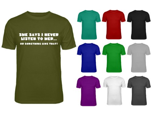 Mens 'She Says I Never Listen' T-shirtBrand new!Mens t-shirt with 'She says I never listen to her... or something like that?' white print on front!T-shirt is 100% cotton.