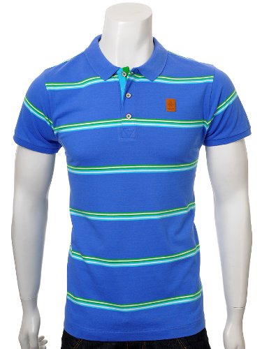 Cromwell polo from "Henri Lloyd" Three button neck HL Jeans logo to the left breast and small detail on neck buttons. Light blue, green and white horizontal stripes across the body and arms.